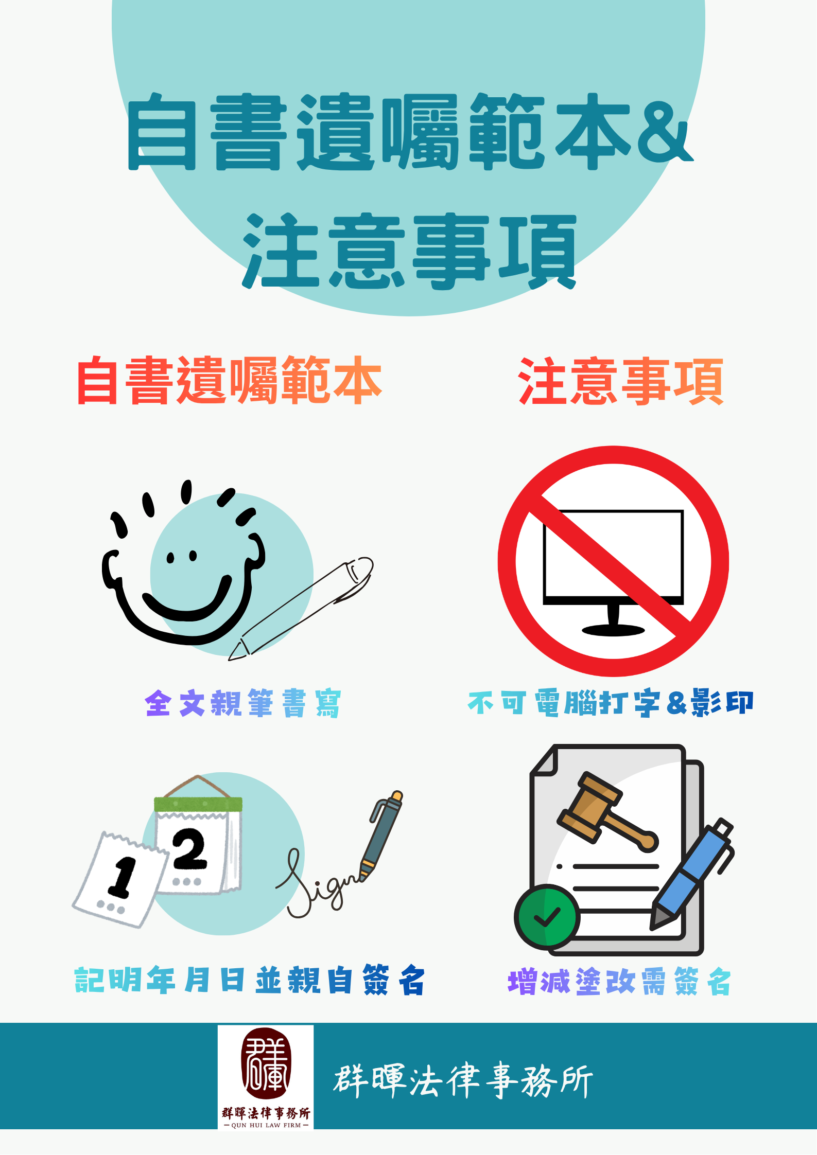 關鍵在於「全文親筆、全文親筆、全文親筆」(很重要所以說三次)、日期完整、簽名,不可打字或影印,且若有塗改需註明增減字數並另行簽名。雖無需見證人或公證即可生效,但建議至法院或公證人處進行認證以防爭議。