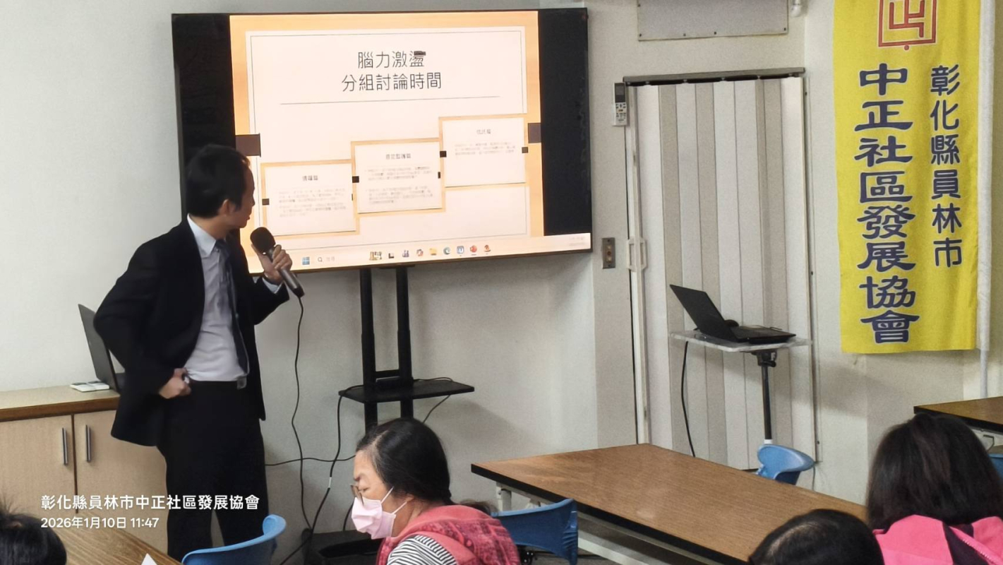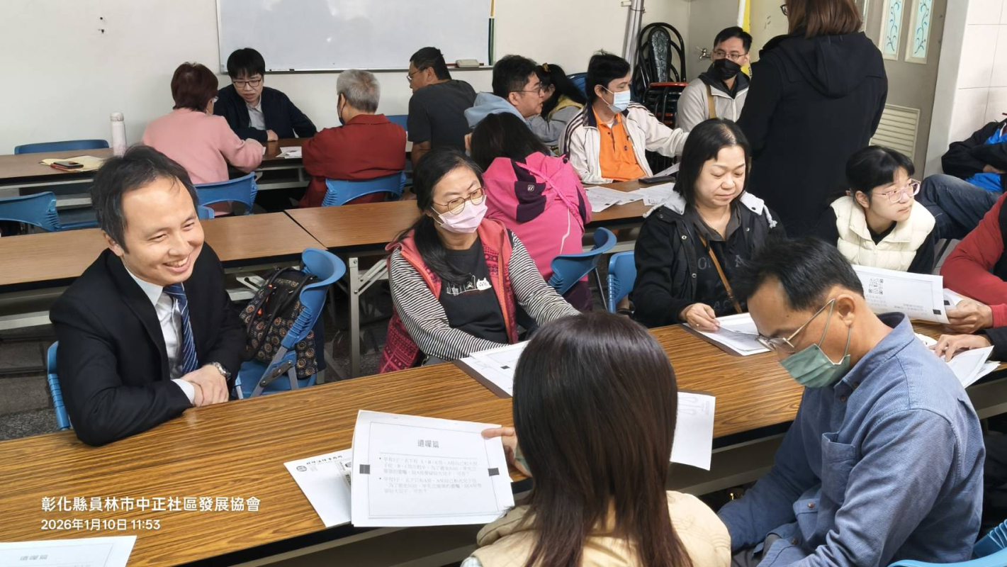 本所劉智偉律師受員林市中正社區發展協會之邀,於115年01月10日在該協會會員大會中分享「如何建構良好傳承典範」,劉律師舉以淺顯生動之案例,並利用腦力激盪時間跟與會來賓互動,透過互動,輕鬆學習並理解預做高齡相關規劃之重要性。